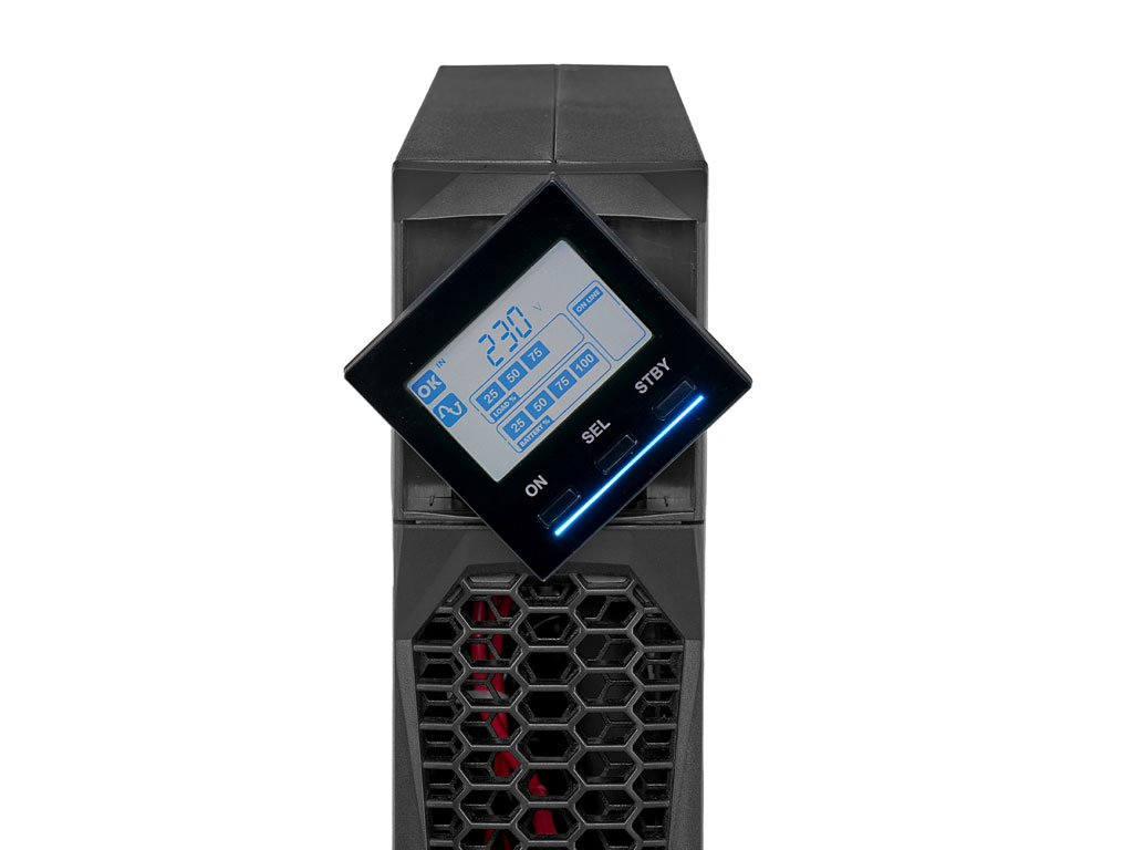Install the plug and play SD2 as either a 2U rackmount UPS or a freestanding tower simply by adding the accompanying handles or optional rack supports. LCD display panel rotates 90 degrees to suit your setup.